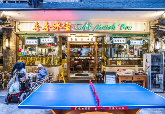 店先に置かれた卓球台、バスの車内のような内装など遊び後ごろ満載の茶餐廳です